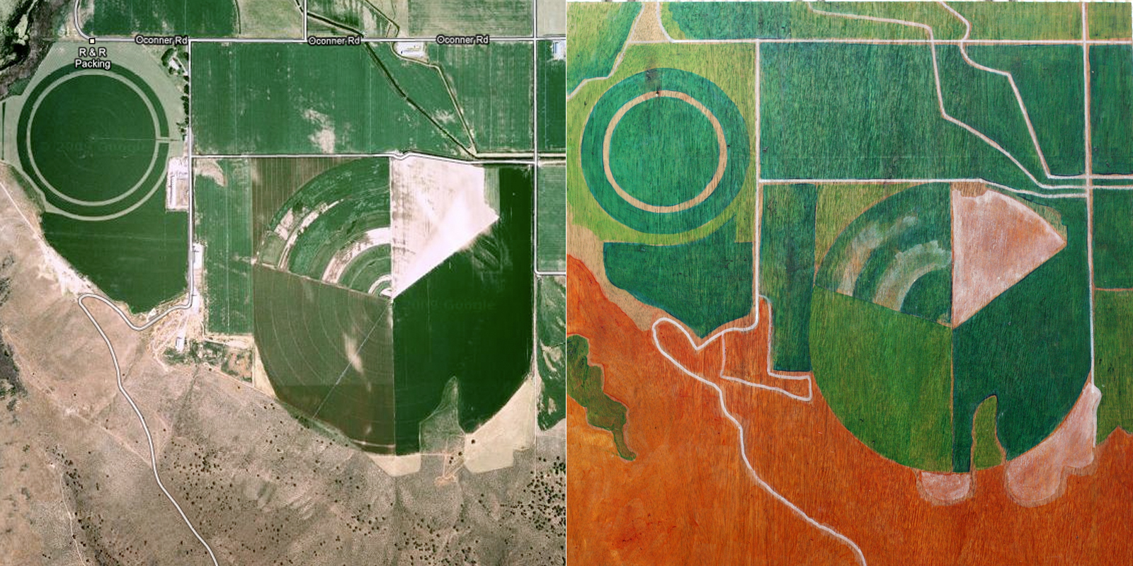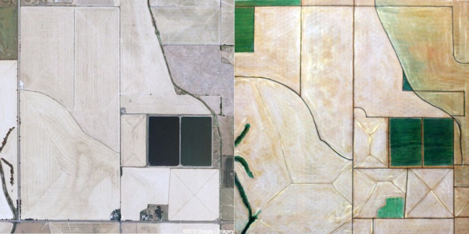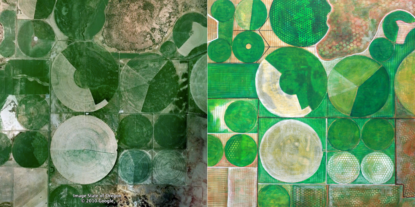 My process involved cropping the screenshots from Google Maps, printing black and white versions at 8×8 inches, and using an architect ruler to scale the 8″ size up to 24″ square. Then I just used a pencil and T-square to map the fields and roads as closely as I could. The circles were traced around vinyl records of various sizes and some other circles I had around. The painting was done in many transparent glazes, sanding in between. I used masking, stenciling and both acrylic on a brush and airbrush. My goal was to stay close to the original color scheme and light/dark values. Here’s some Google shots vs. my final paintings. Obviously the Google shots are on the left. I’ll label each one with the approximate location in Oregon. Have fun spotting differences!