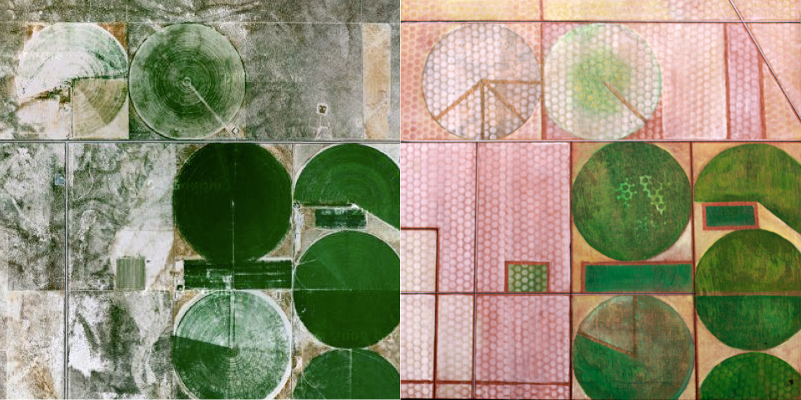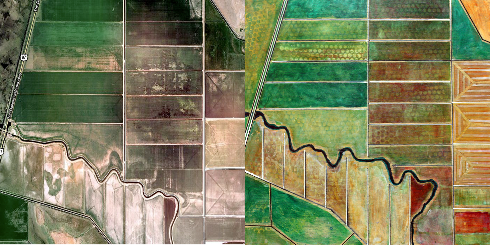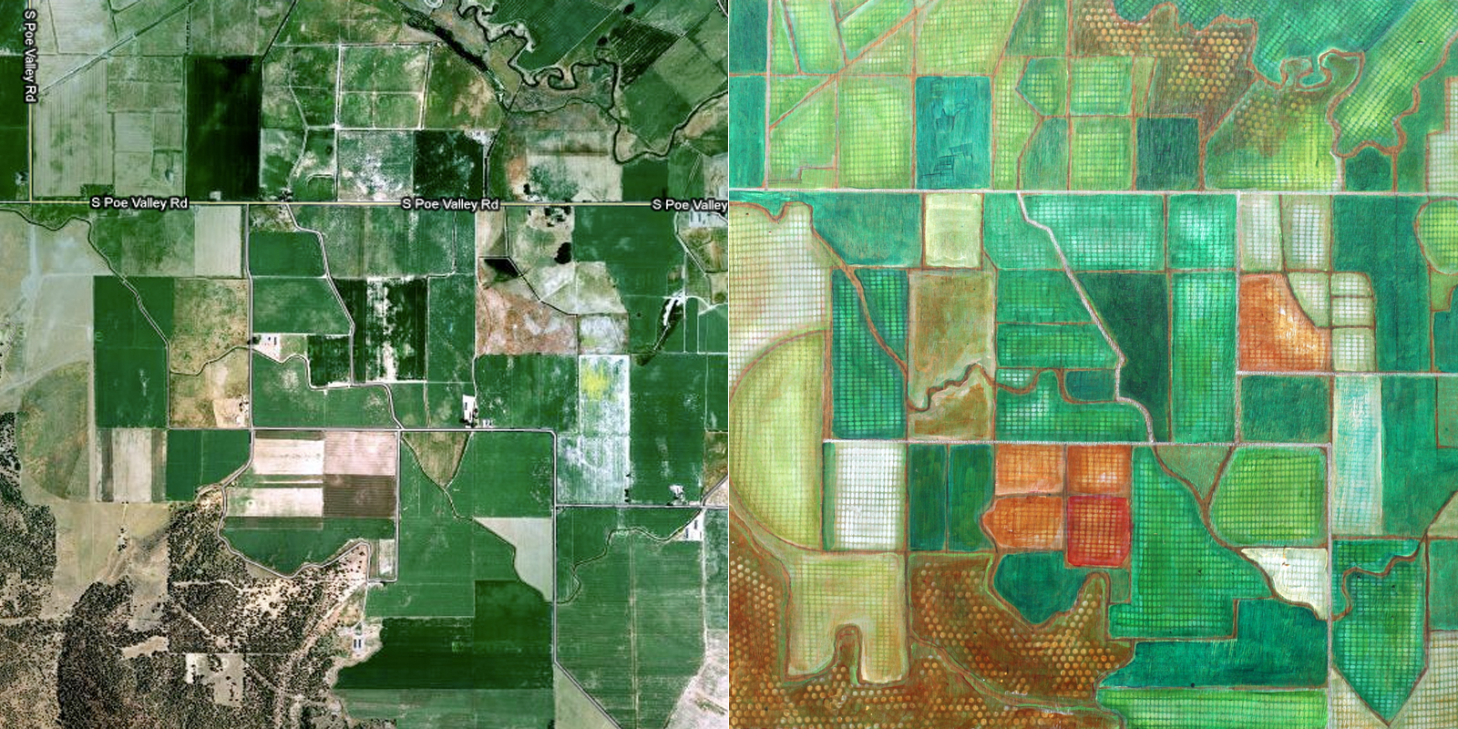 My process involved cropping the screenshots from Google Maps, printing black and white versions at 8×8 inches, and using an architect ruler to scale the 8″ size up to 24″ square. Then I just used a pencil and T-square to map the fields and roads as closely as I could. The circles were traced around vinyl records of various sizes and some other circles I had around. The painting was done in many transparent glazes, sanding in between. I used masking, stenciling and both acrylic on a brush and airbrush. My goal was to stay close to the original color scheme and light/dark values. Here’s some Google shots vs. my final paintings. Obviously the Google shots are on the left. I’ll label each one with the approximate location in Oregon. Have fun spotting differences!