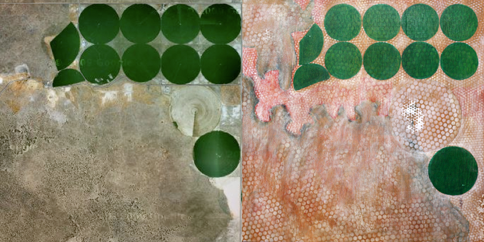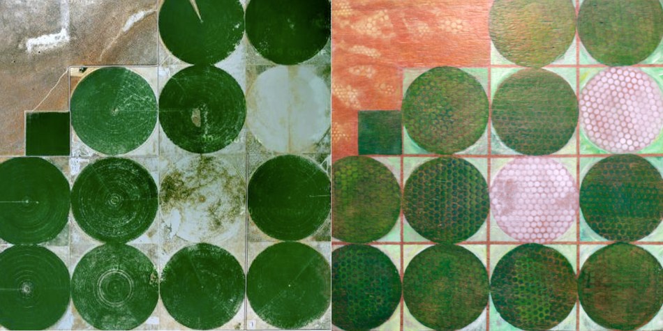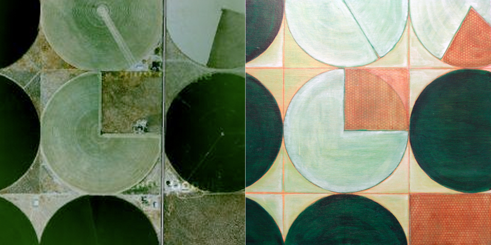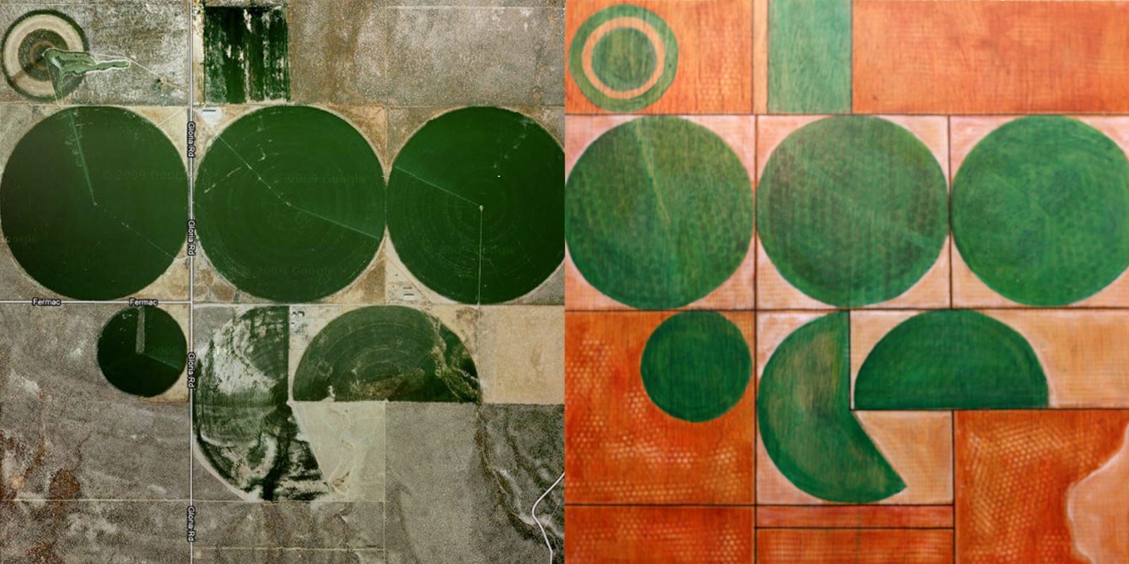 I’ve wanted to paint versions of large scale man-made compositions, since flying home from Los Angeles years ago and photographing suburban cul-de-sac patterns as we flew north. Years later, Google brought us Google Maps and Google Earth and now we can fly everywhere, looking for pattern and composition. I started with Oregon and was drawn to the irrigation circles created by agriculture in the dryer central regions of the state. Many of the screenshots that I snapped are areas near Klamath Falls and Christmas Valley. I took notes on the locations; in retrospect, I wish that I’d copied down latitude and longitude coordinates. In the future, I’ll be more specific with my titles!